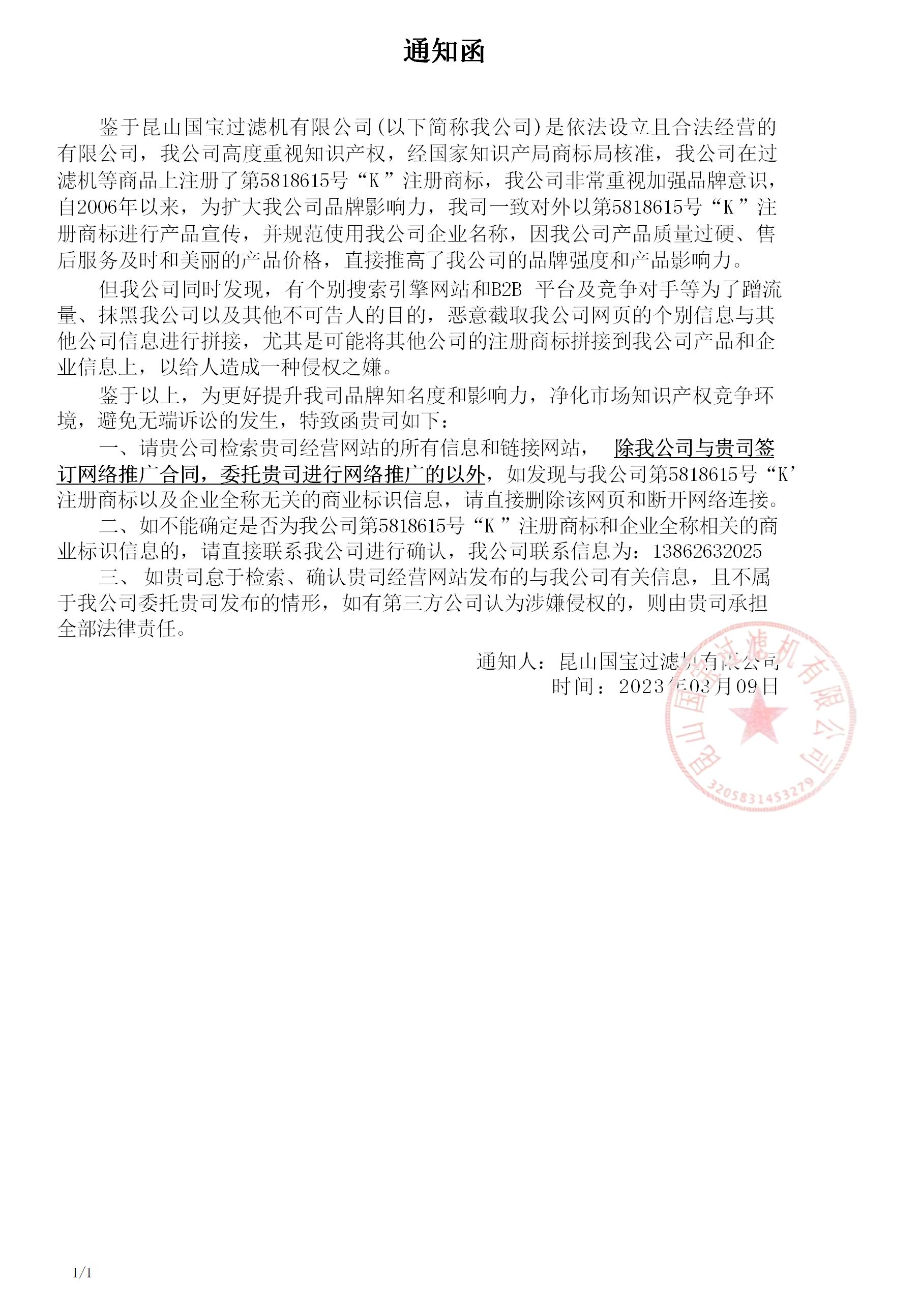 一、我公司合法使用的商標(biāo)是第5818615號(hào)“K”注冊(cè)商標(biāo),我公司的企業(yè)全稱是昆山國(guó)寶過濾機(jī)有限公司,我公司對(duì)外推廣宣傳僅使用的是我公司第5818615號(hào)“K”注冊(cè)商標(biāo)和企業(yè)全稱進(jìn)行,故市場(chǎng)所有出現(xiàn)的其他商標(biāo)標(biāo)識(shí)的行為均不是我公司所為,與我公司無關(guān)。